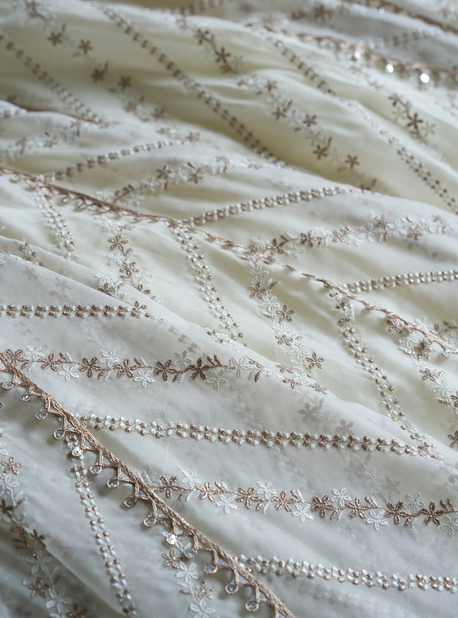 Mulmul Organza Paneled Lehenga With Diagonal Gota And Embroidery Detailing Will Add To Your Summer Wedding Wardrobe. This Comes With A Matching Silk Blouse Piece. The Lehenga Has A Shantoon Lining With a Cancan. This Comes With A? Ÿorganza Dupatta With A Border And Diagonal Embroidery.