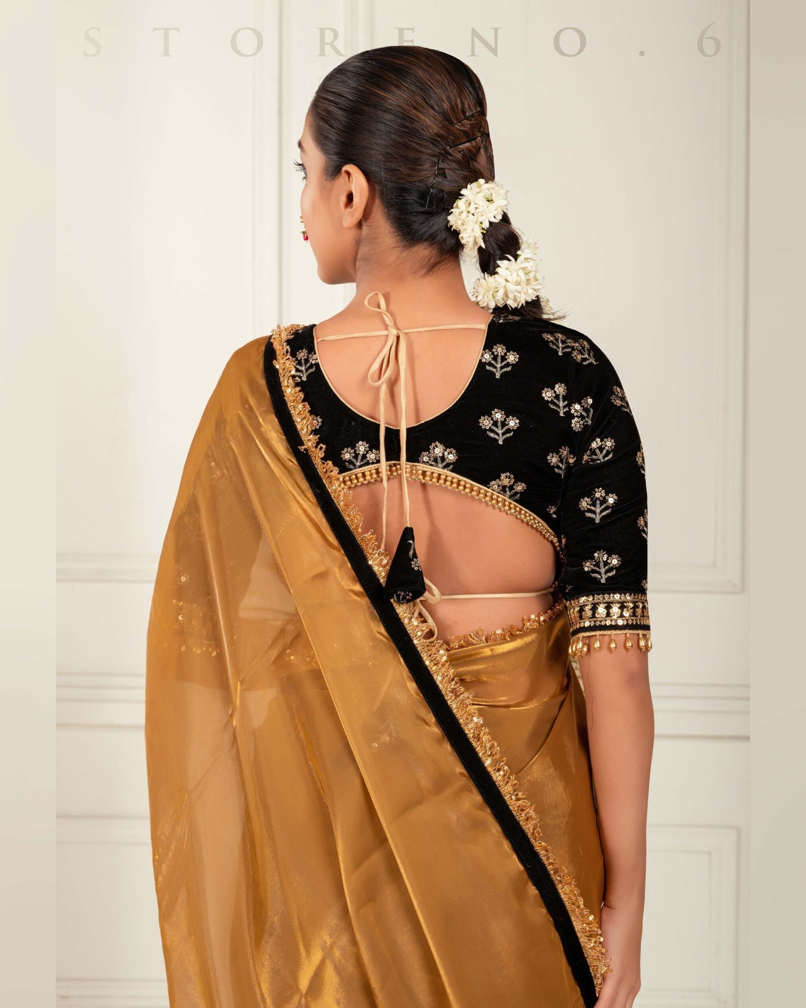 • Black Velvet Embroidered Blouse Embellished With Golden Zari And Sequins Work,Adding Black And Golden Border And Beads.