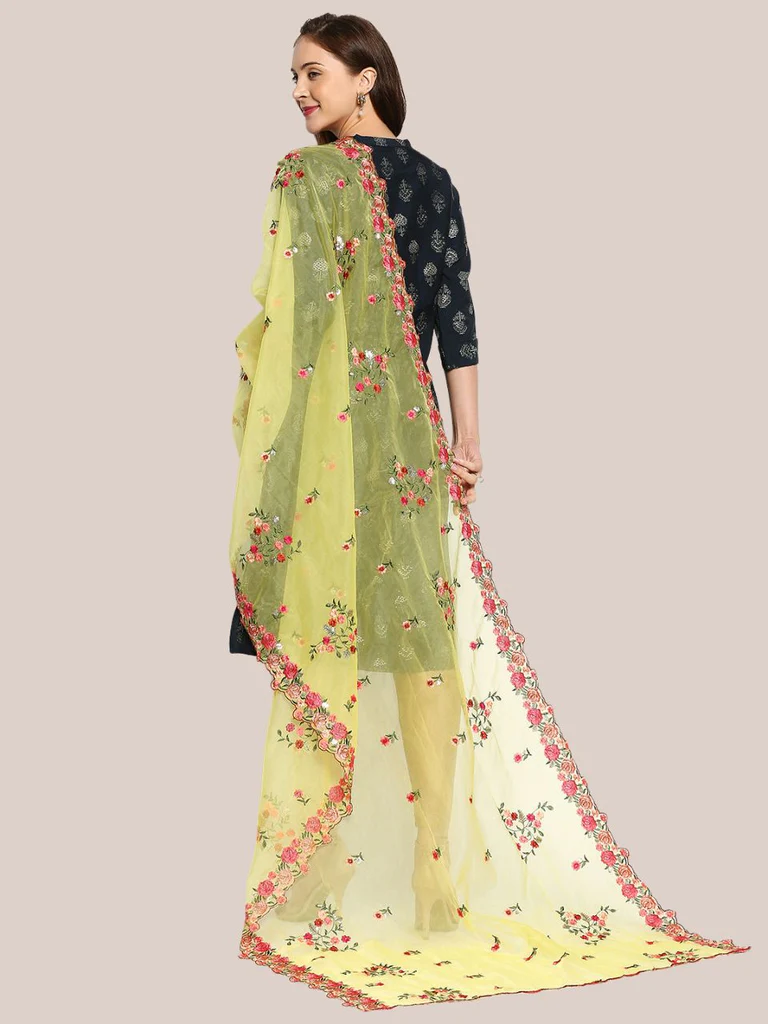 Let this season see you welcome the beauty of this organza dupatta to your ethnic fashion mix, showcasing eye some elegance and gorgeous grace! This alluring creation is adorned with beautiful multicolor floral embroidery all over. It will definitely give your feminine charm a hint of subdued elegance.