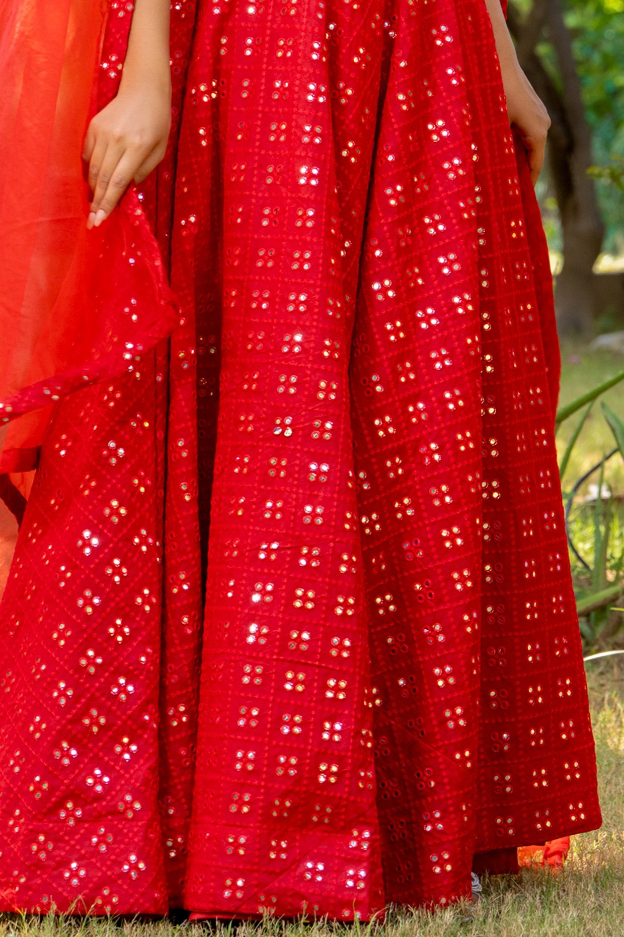 Featuring a red lehenga in georgette base with thread, mirror and tassels embroidery. It is paired with a blouse and an organza dupatta. Accentuate with chandbali earrings and heels for a wedding or sangeet ceremony.