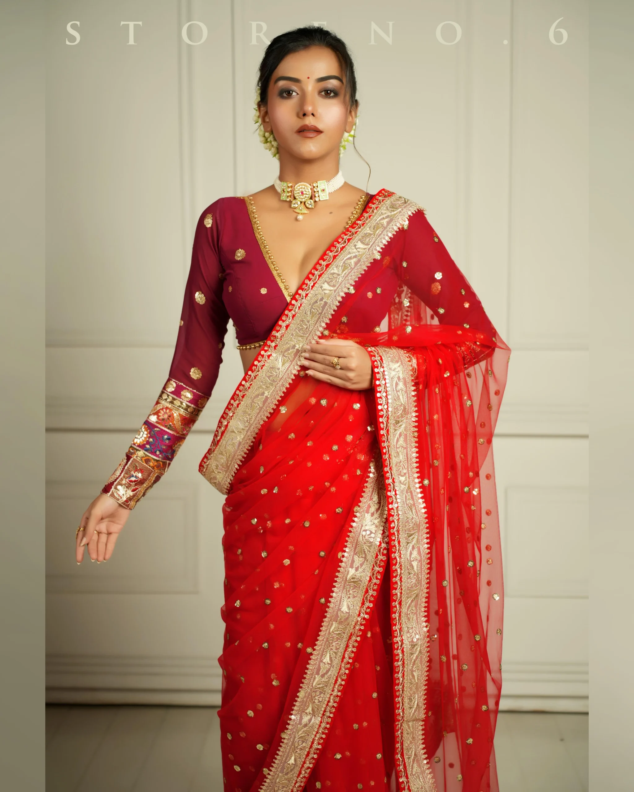 - Multi-Colour Sequins and Thread Works on Deep Maroon Georgette Blouse. Full Sleeves With Diamond-Shaped Back